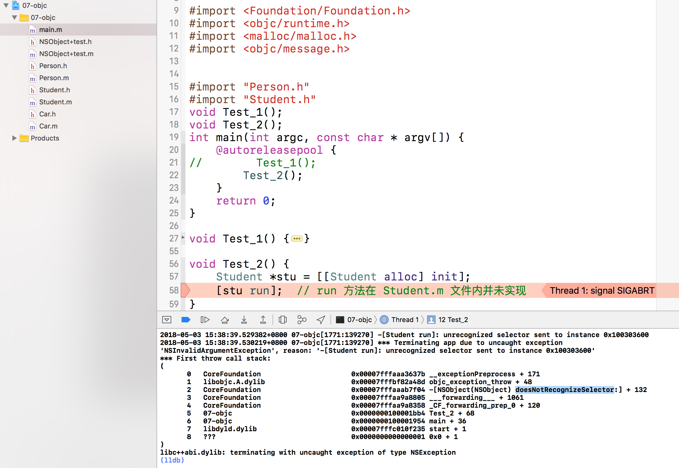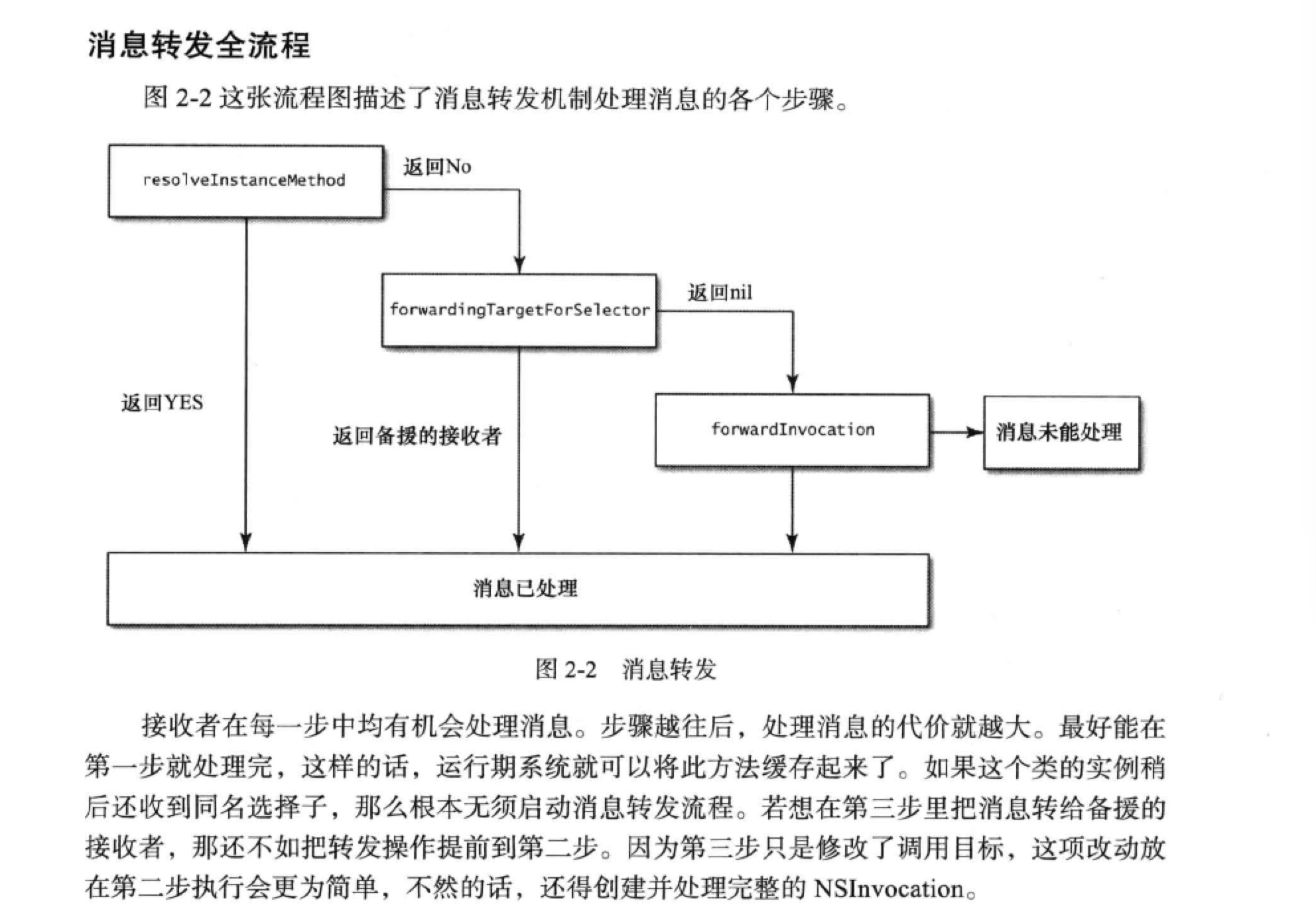 在编译期间向某类发送了其无法解读的消息并不会报错,因为在运行期可以继续向类中添加方法,所以编译器在编译时还无法确认类中会不会有该方法的实现。当最终都没能解读此消息后,就会启动 消息转发(message forwarding)机制。如果经过消息转发阶段仍未找到对象执行解读此消息,结果则会调用“doesNotRecognizeSelector”方法抛出异常以程序崩溃而告终。不过开发者在编写自己的类时,可在消息转发阶段设置“挂钩”,用以执行预定的逻辑,而不至于应用程序崩溃。
