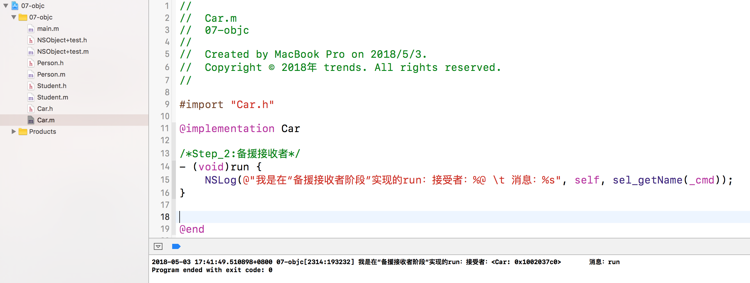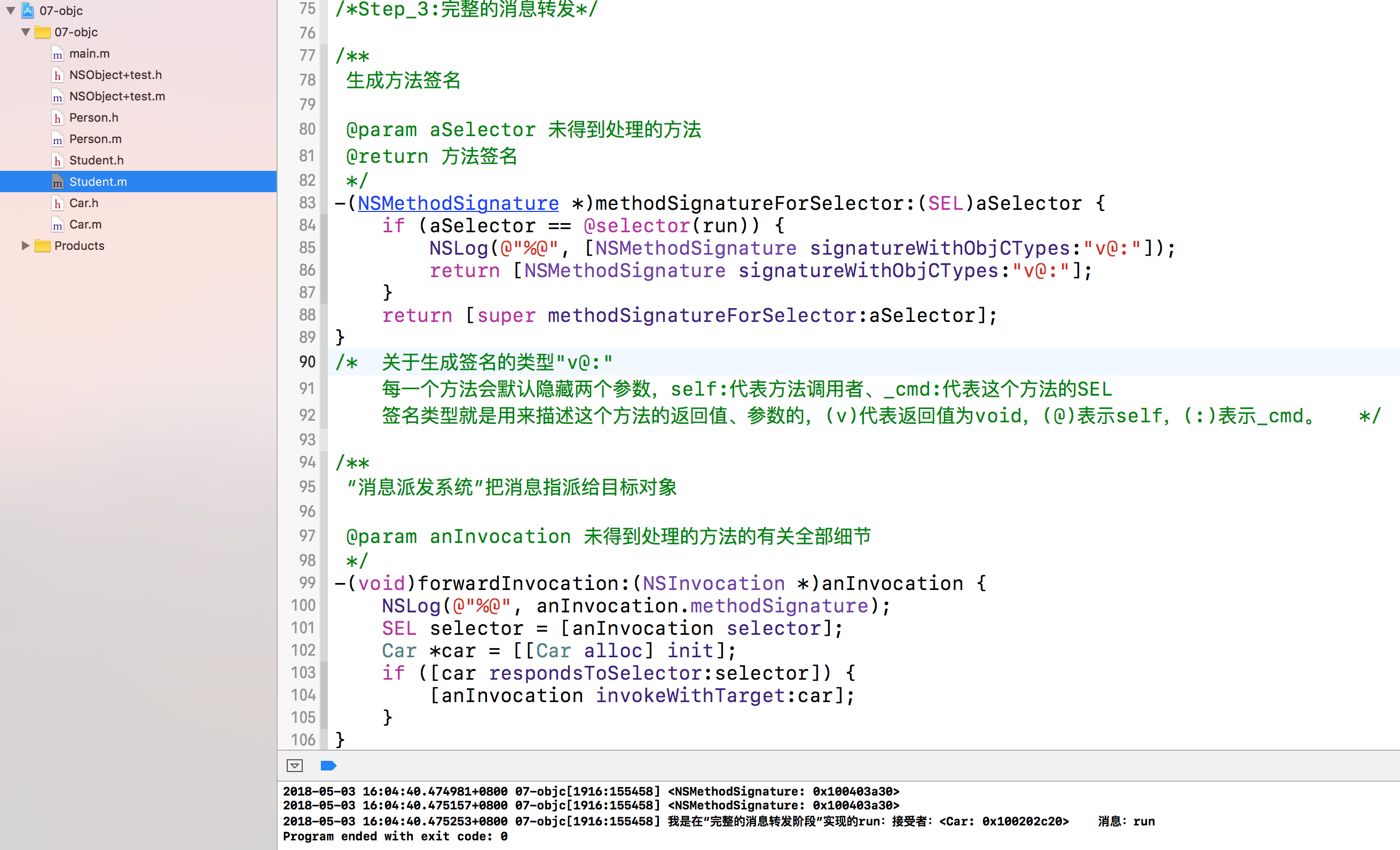消息转发阶段分为两大阶段:第一阶段会先征询接受者所属的类,看其是否为该方法动态添加了方法的实现部分,称为“动态方法解析”(dynamic method resolution);如果仍没解决问题会来到第二阶段,如果来到了该阶段,代表着接受者自己就无法再以动态新增方法的手段来响应该消息了。此时,运行期系统会请求接受者以其他手段来处理与消息相关的方法调用,又细分为两步:首先请接受者看有没有其他对象“备援的接受者”(replacement receiver)来处理这条消息,若存在,则把消息转发给那个对象,消息转发结束。若没有,则启动“完整的消息转发机制”(full forwarding mechanism),运行期系统会把与该消息有关所有的细节封装到 NSInvocation 对象中,再给接受者最后一次机会,令其设法解决当前还未处理的消息。1、动态方法解析(dynamic method resolution)
