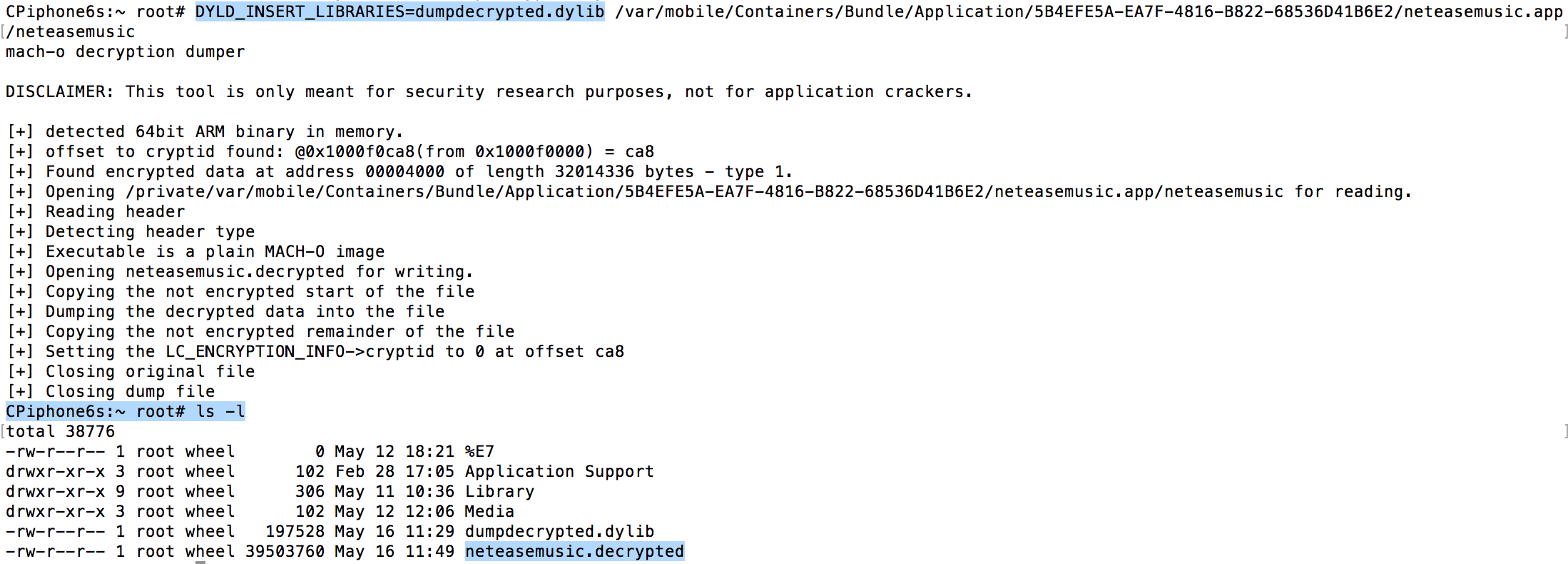 DYLD_INSERT_LIBRARIES将.dylib动态库文件注入到待脱壳程序中。DYLD_INSERT_LIBRARIES=dumpdecrypted.dylib 待脱壳程序路径