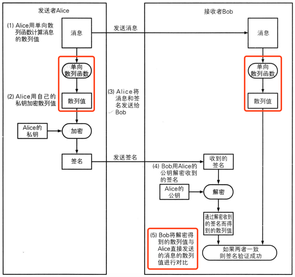 数字签名就是附加在报文上的特殊计算出来的加密校验码。它可以验证报文内容是否被篡改,但不是用来保证报文的机密性。通常是用非对称公开密钥技术产生。首先使用摘要函数将报文数据转换为固定长度的散列值;使用“指纹”一样的私钥对散列值进行加密;将加密的结果与原始报文数据一并发送给接收者。接收者则使用公开的公钥解密出相应的散列值,然后与接收到的原始报文数据产生的散列值进行比对。